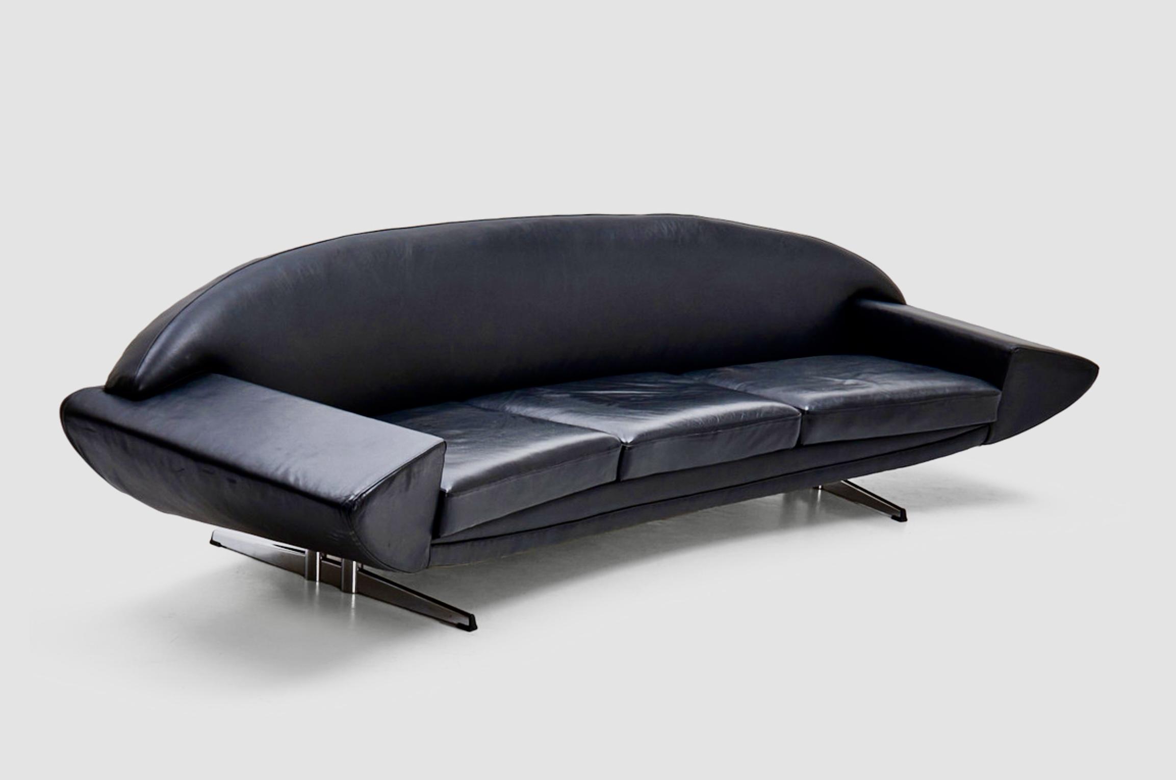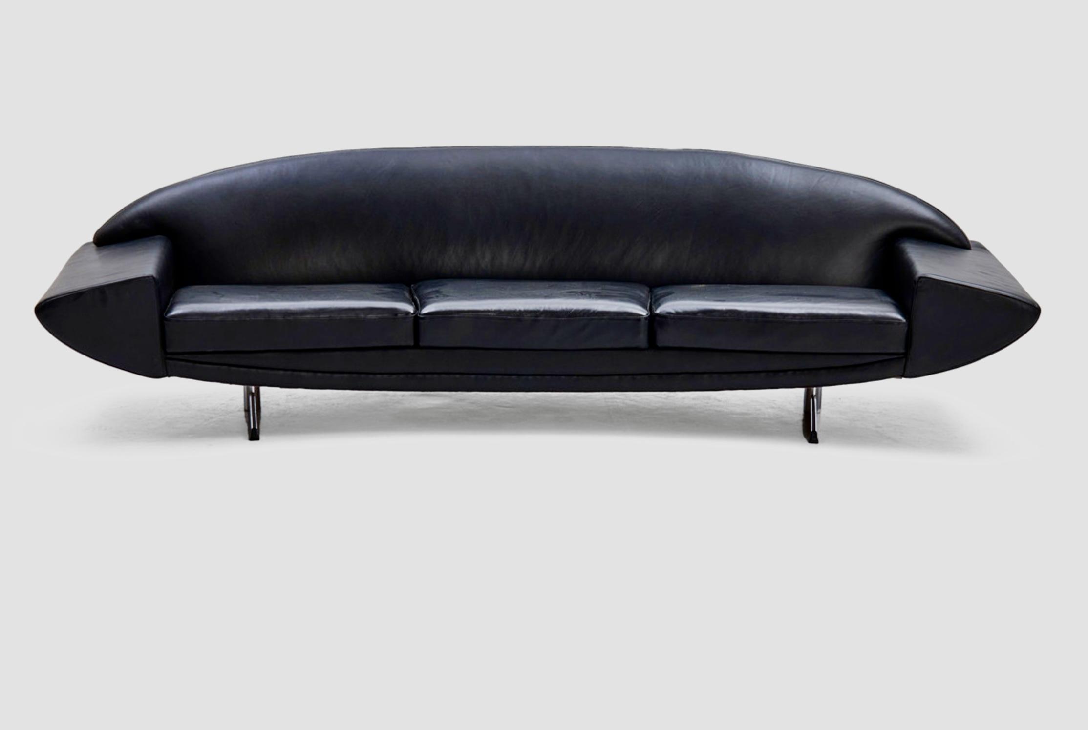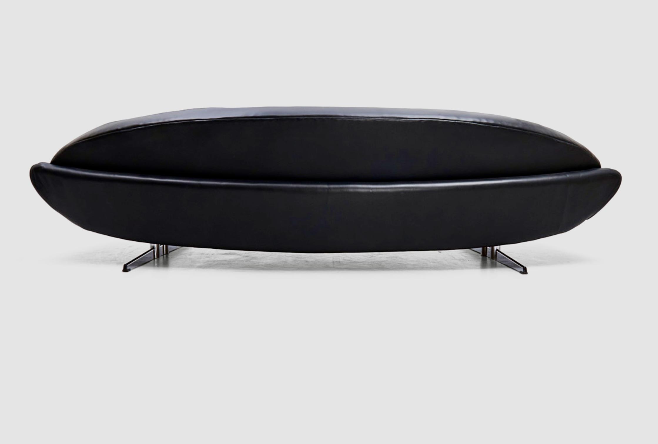 Rare canapé scandinave incurvé modèle Capri en cuir de Johannes Andersen. Fluide et aérien ce canapé pourrait faire penser à un bateau ou même à un vaisseau spatial. Il repose sur des piètements en métal chromé…