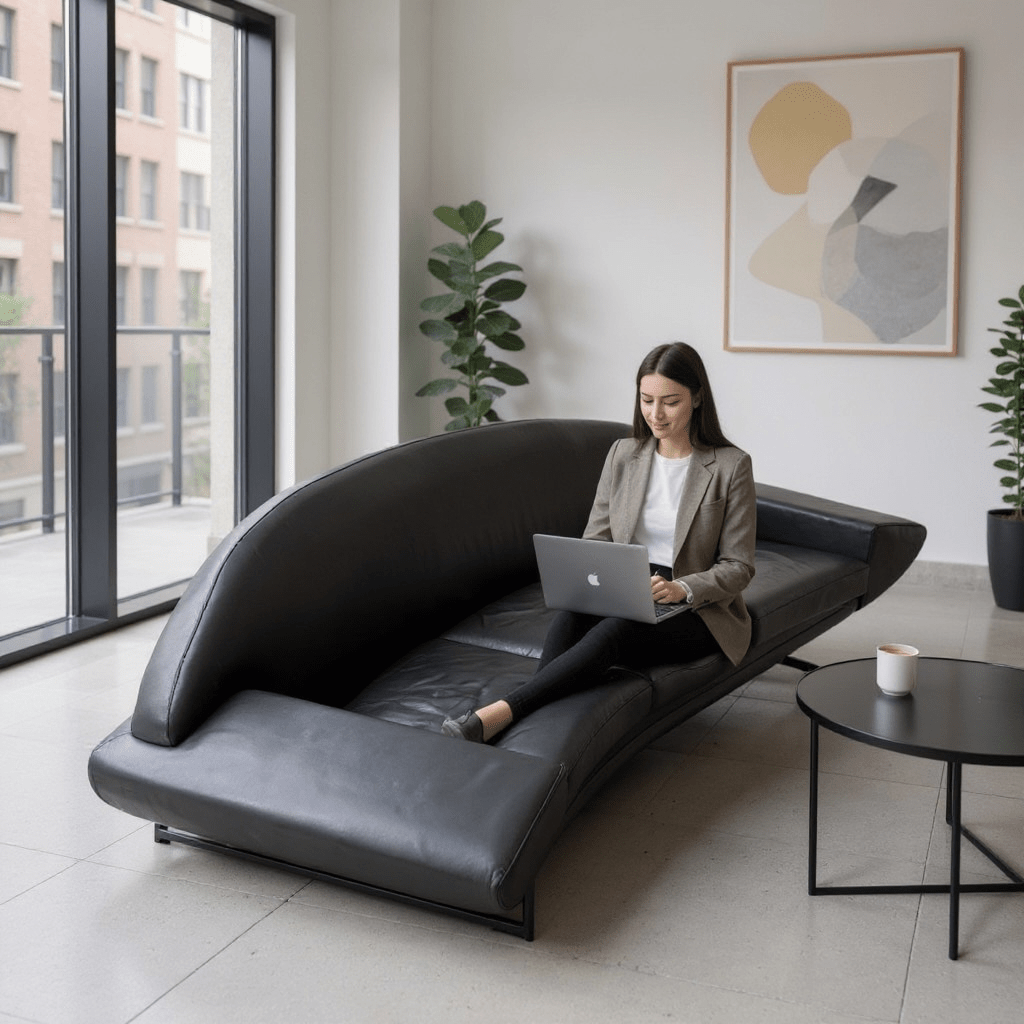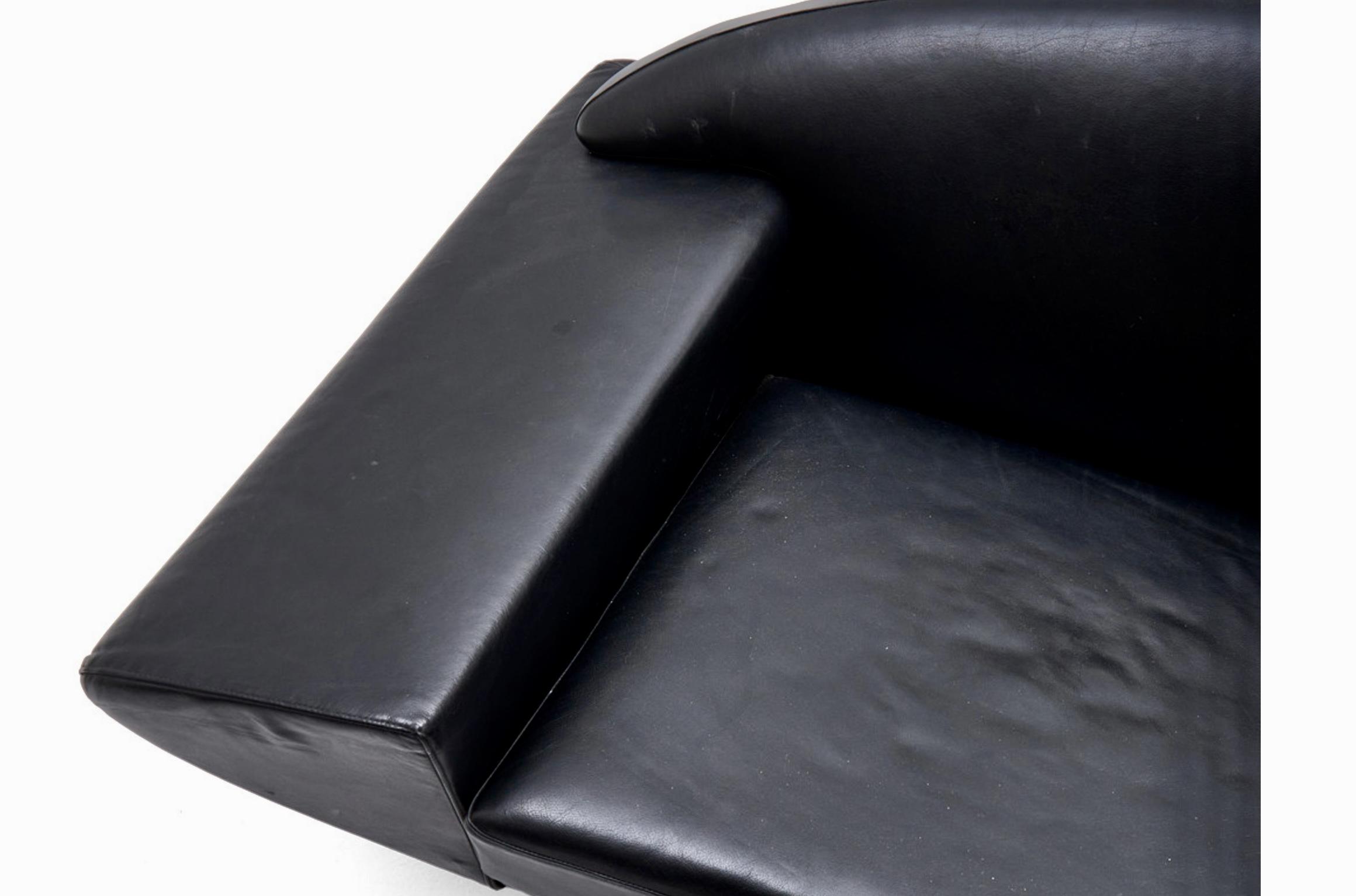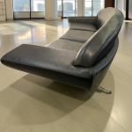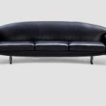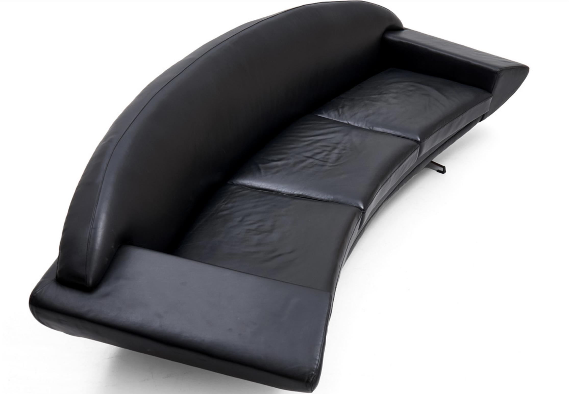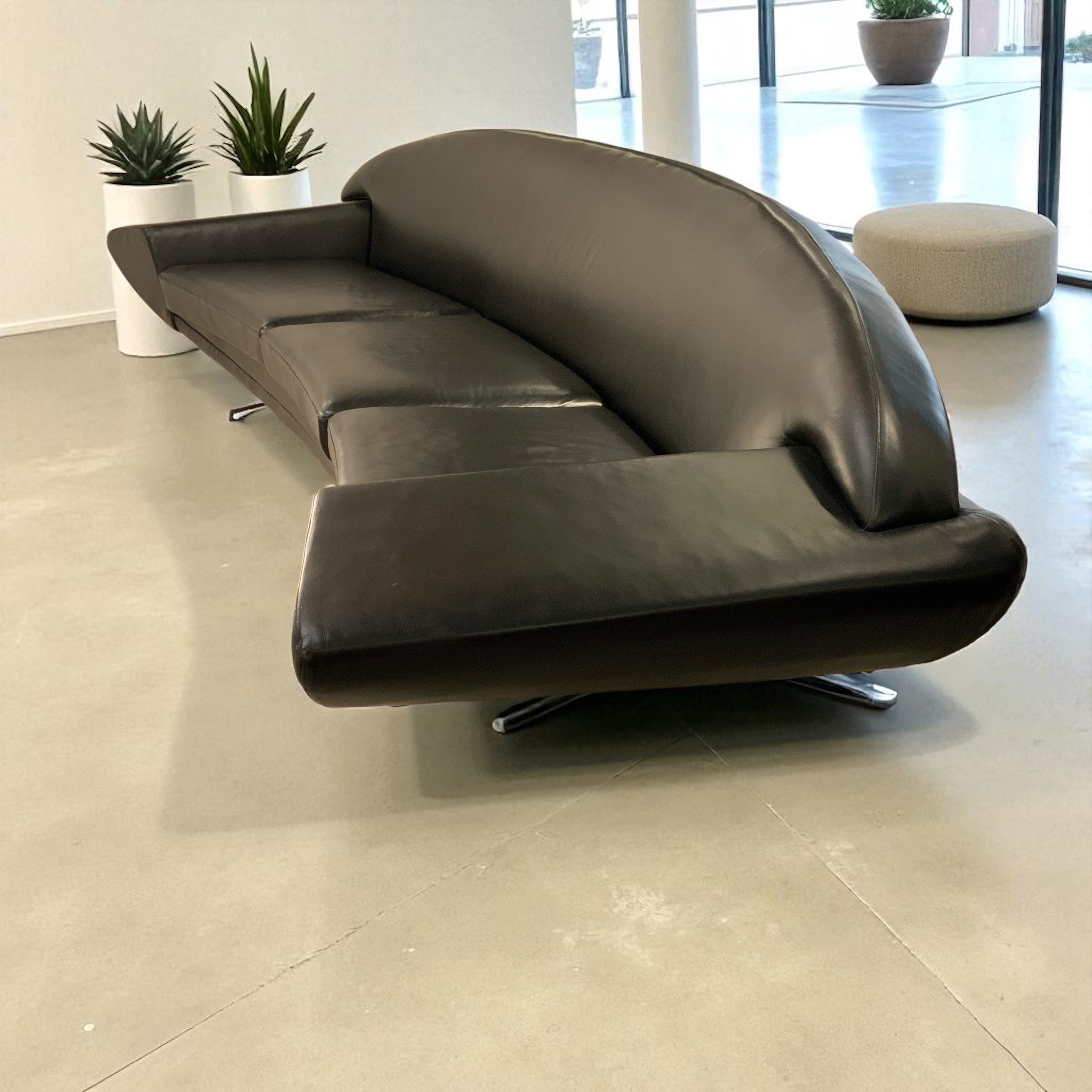 Rare canapé scandinave incurvé modèle Capri en cuir de Johannes Andersen. Fluide et aérien ce canapé pourrait faire penser à un bateau ou même à un vaisseau spatial. Il repose sur des piètements en métal chromé…