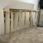Exceptionnelle console du créateur Français Stéphane Le Meur, elle est composée d’une magnifique pierre d’Onyx reposant sur une ceinture et des pieds cubique de différentes sections se rétrécissant par sections vers le bas, ainsi qu’un genre de stalactites aléatoirement disposées également en laiton avec des pierres de Sélénite à leur embouts.