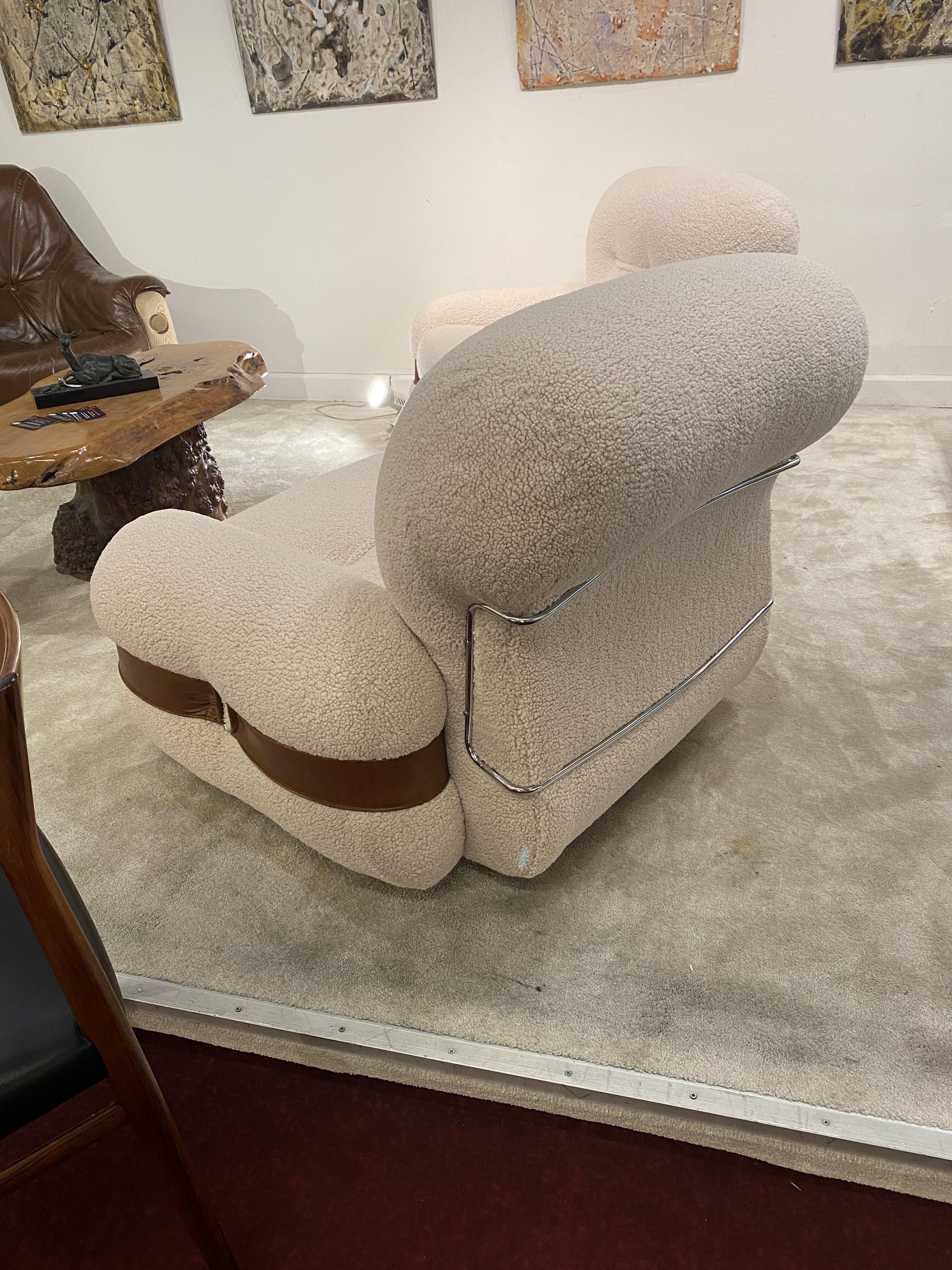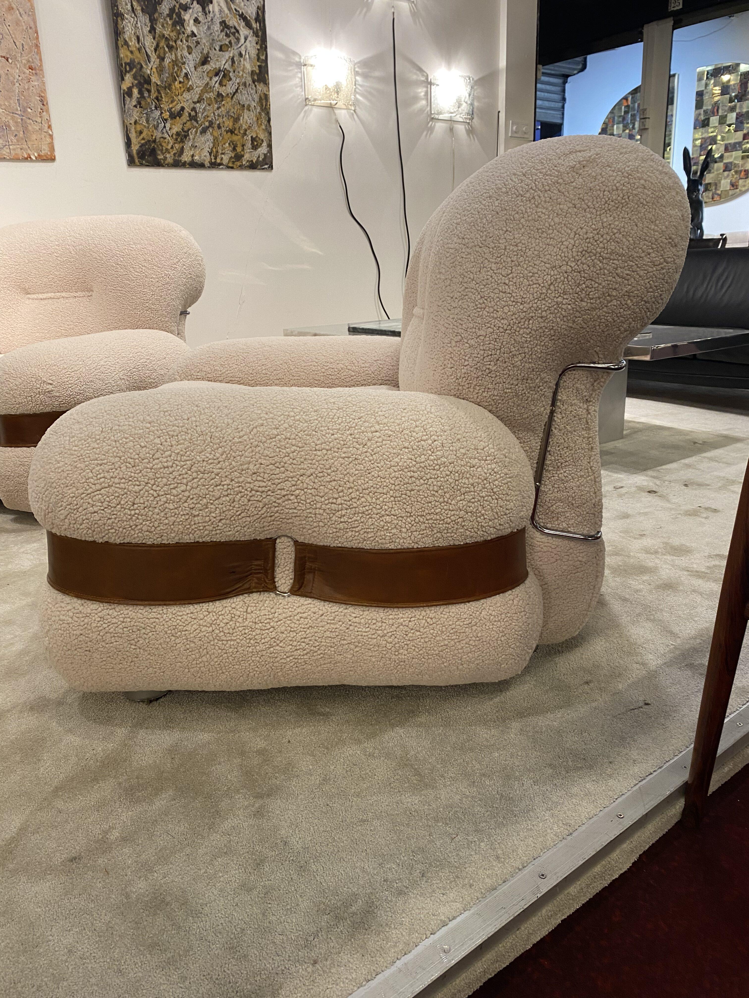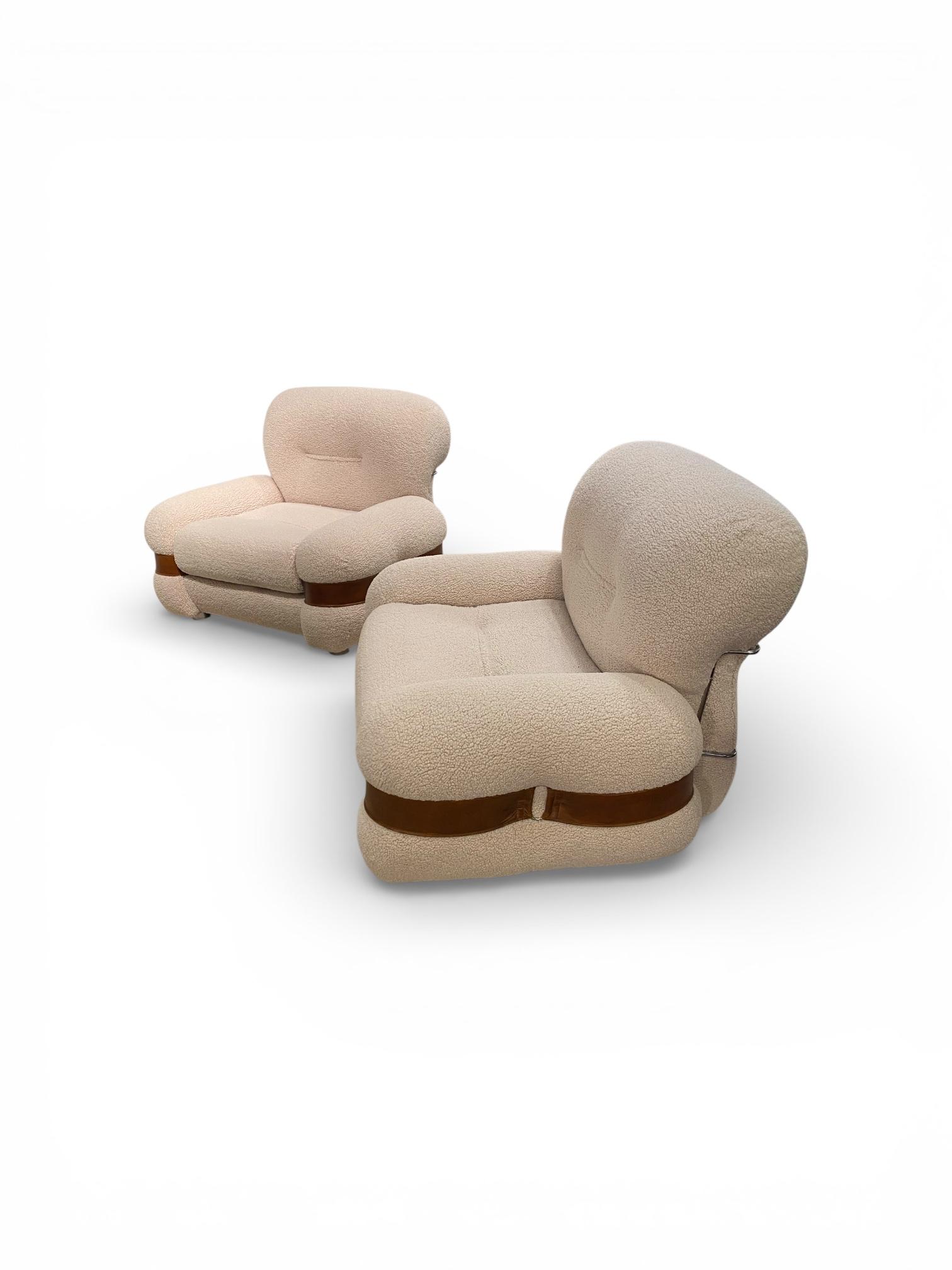 Généreuse et très confortable paire de fauteuils italiens en tissu, cuir et métal des années 1970.