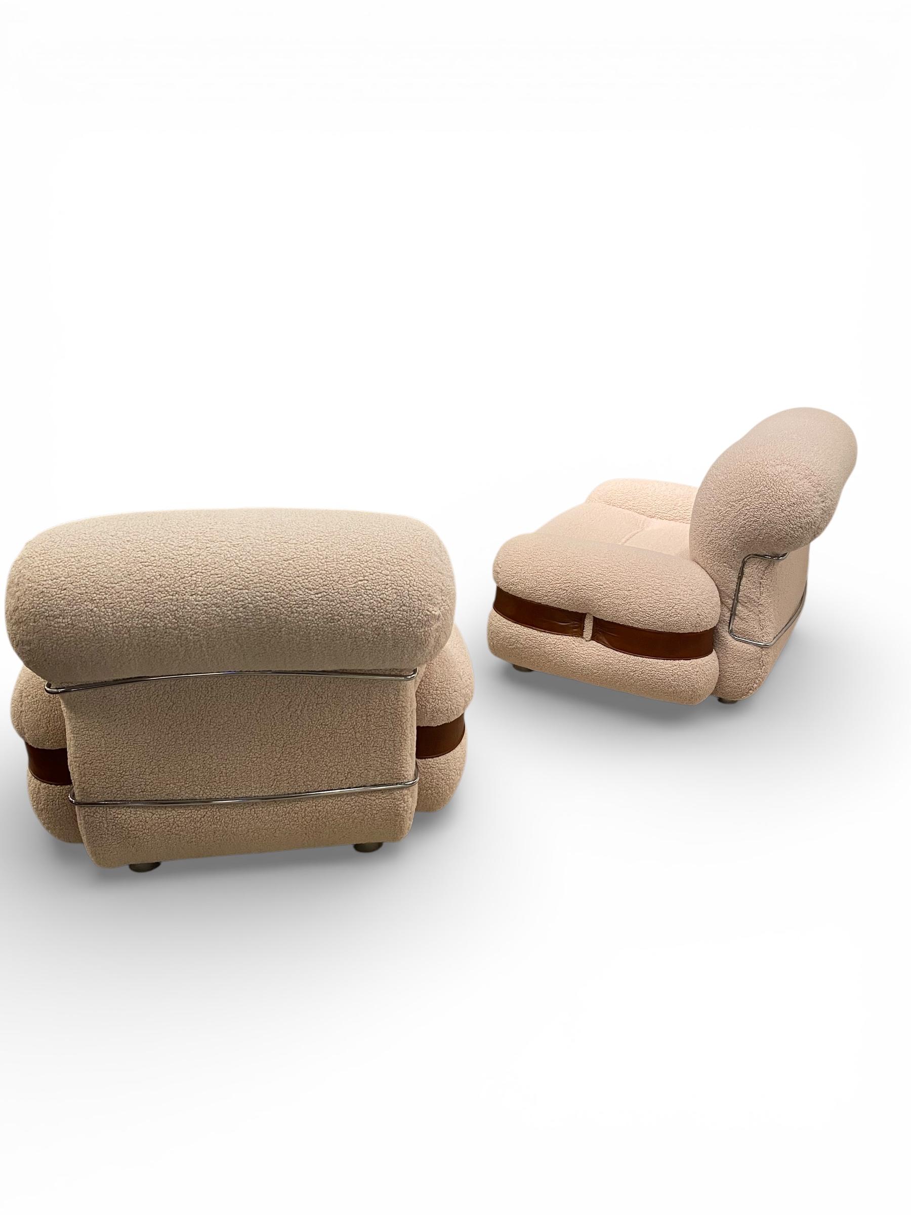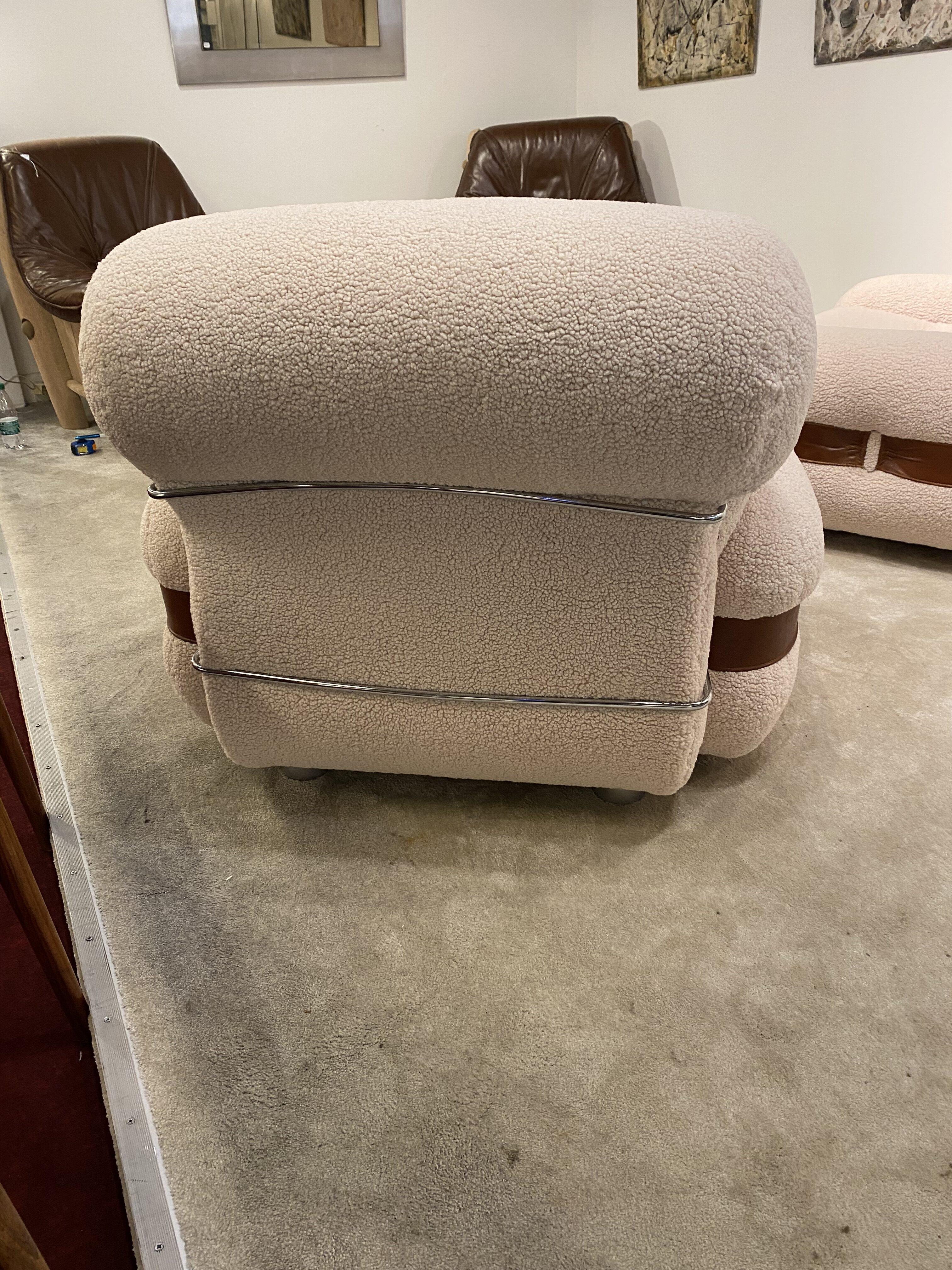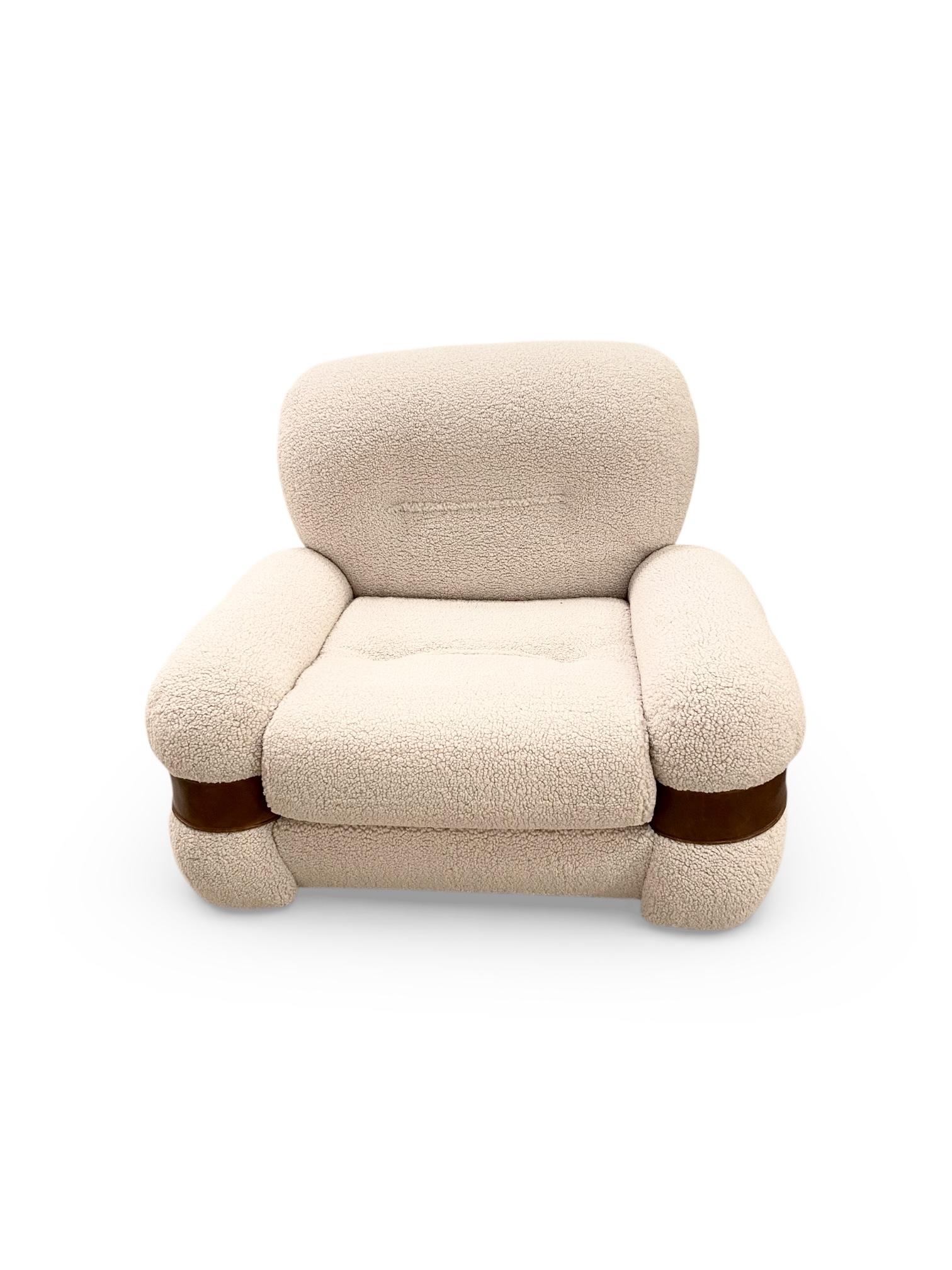 Généreuse et très confortable paire de fauteuils italiens en tissu, cuir et métal des années 1970.