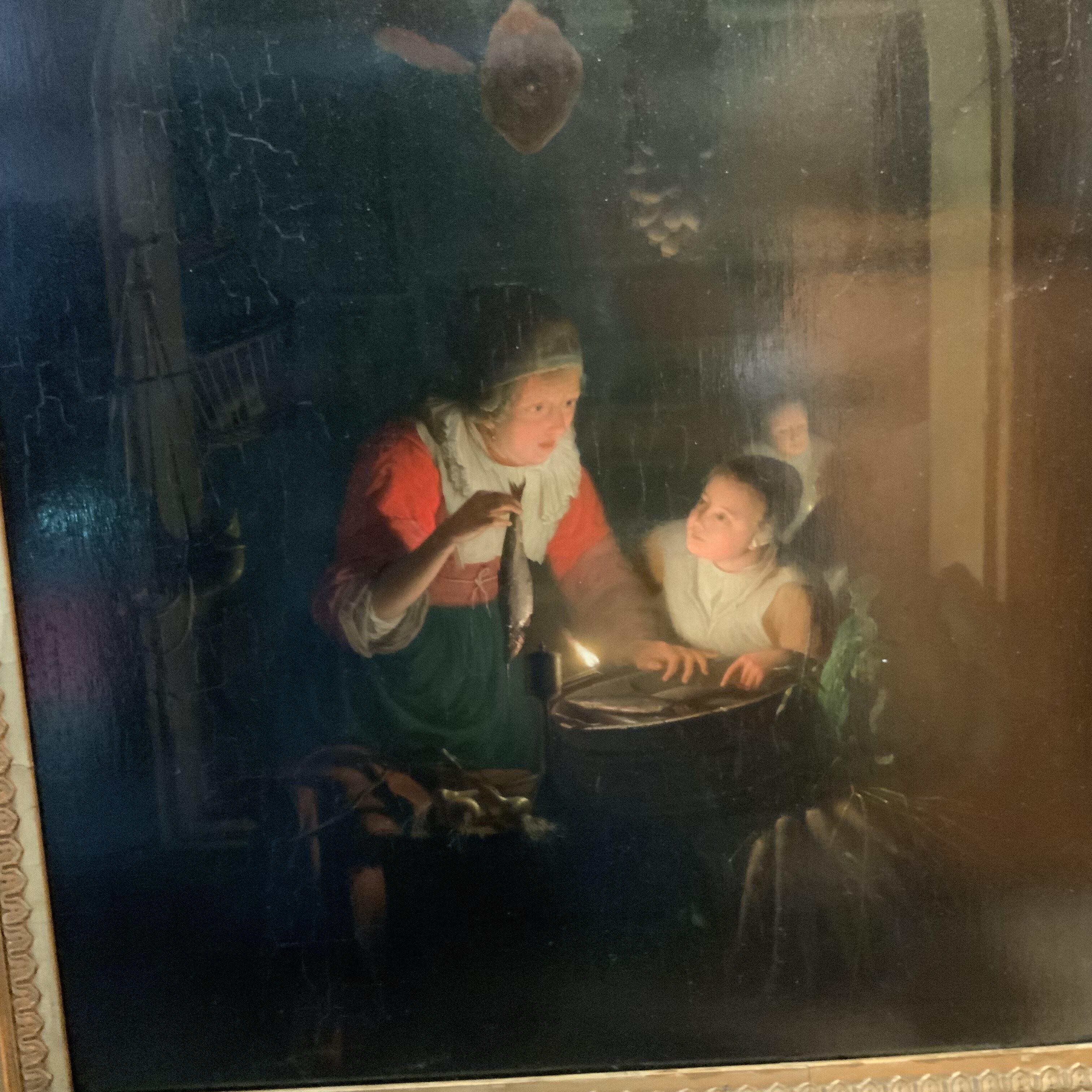 Merveilleuse ambiance pour cette très charmante huile sur panneau école Française représentant une scène familiale en clair obscur du début du XIXème siècle, joliment encadré.