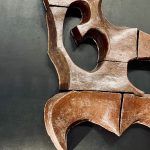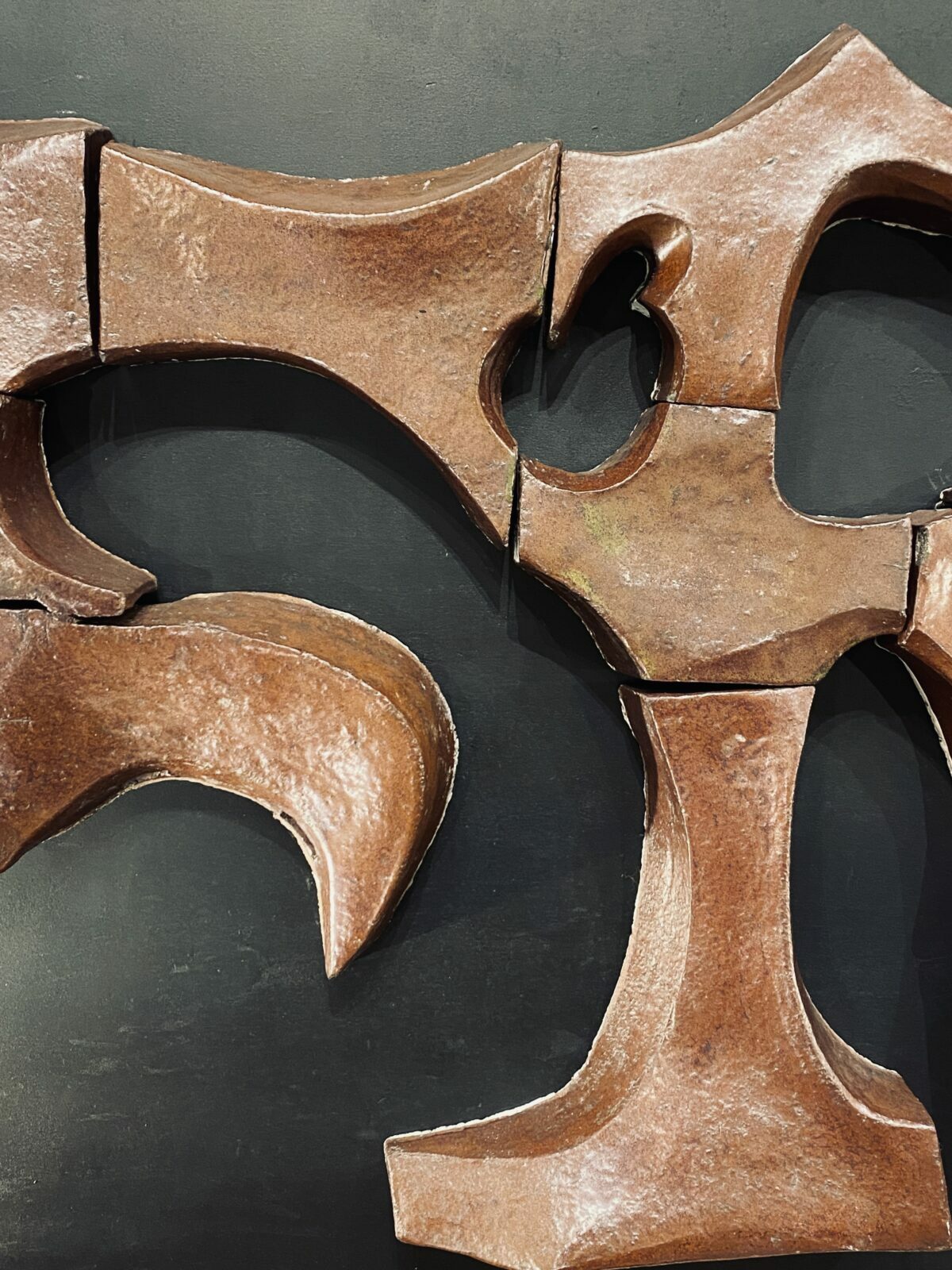 Exceptionnel panneau abstrait en terre chamotte, émaillée irisée représentant un taureau stylisé. Les éléments sont assemblés un par un sur un panneau rapporté peint en noir.
