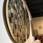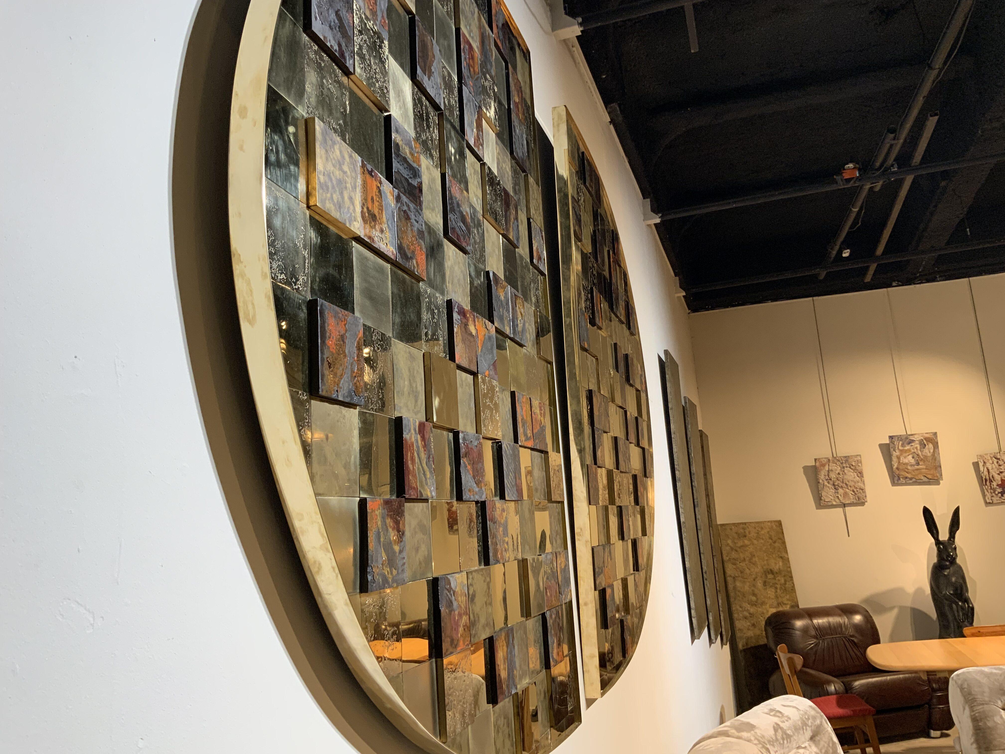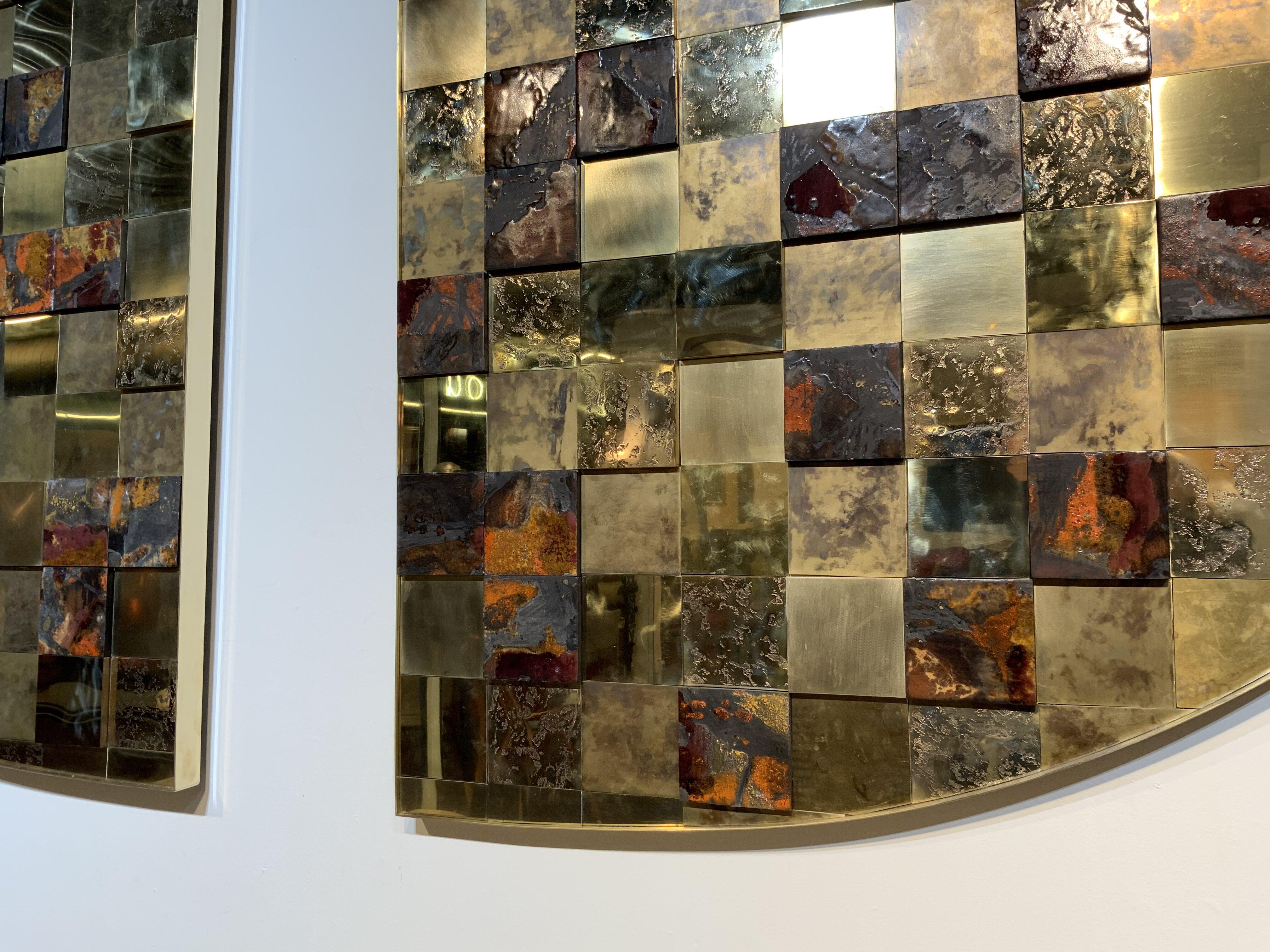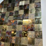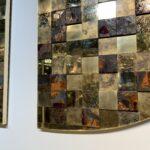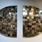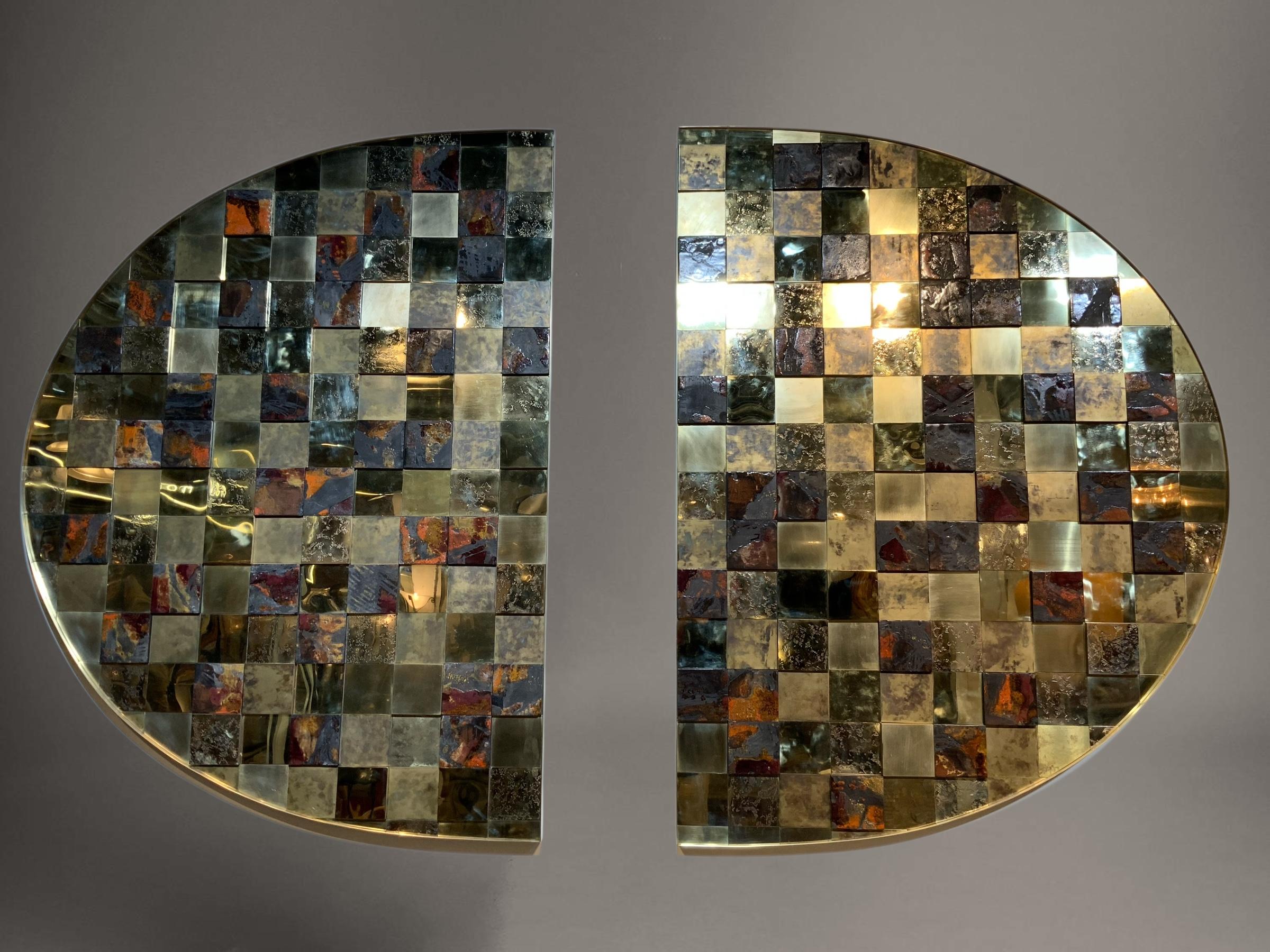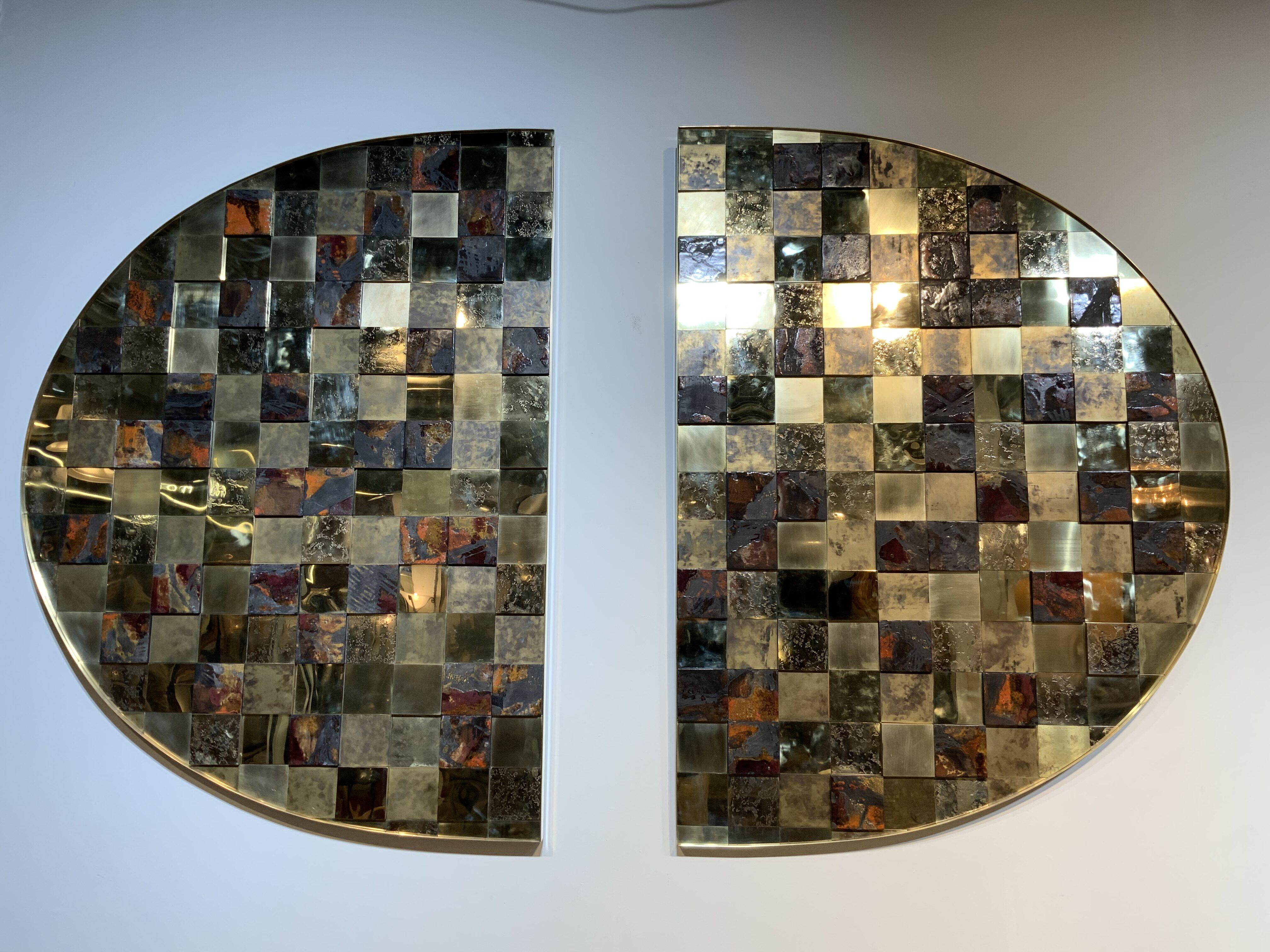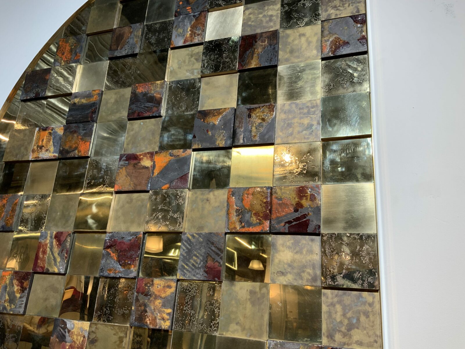 Grand panneau mural en forme de deux demi-ovales horizontaux, il se compose de carreaux en céramique des années 1960/70 et laiton travaillé de diverses façon, formant un lumineux et scintillant damier en relief…