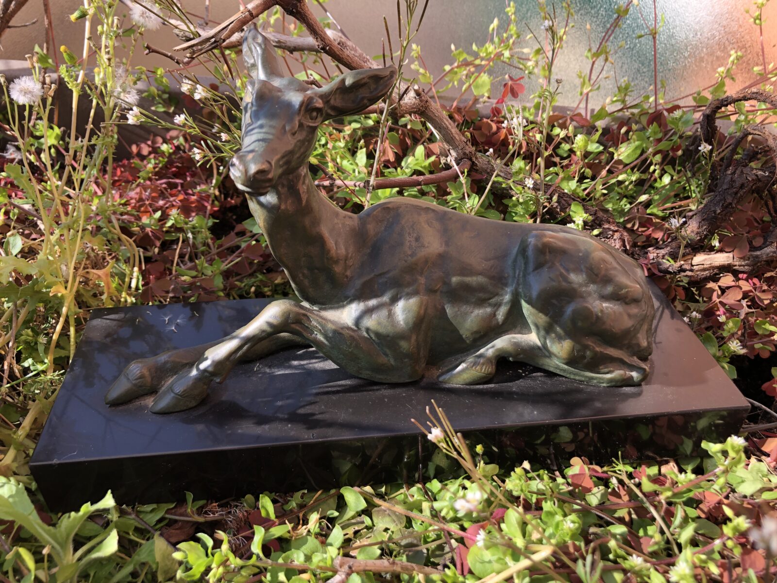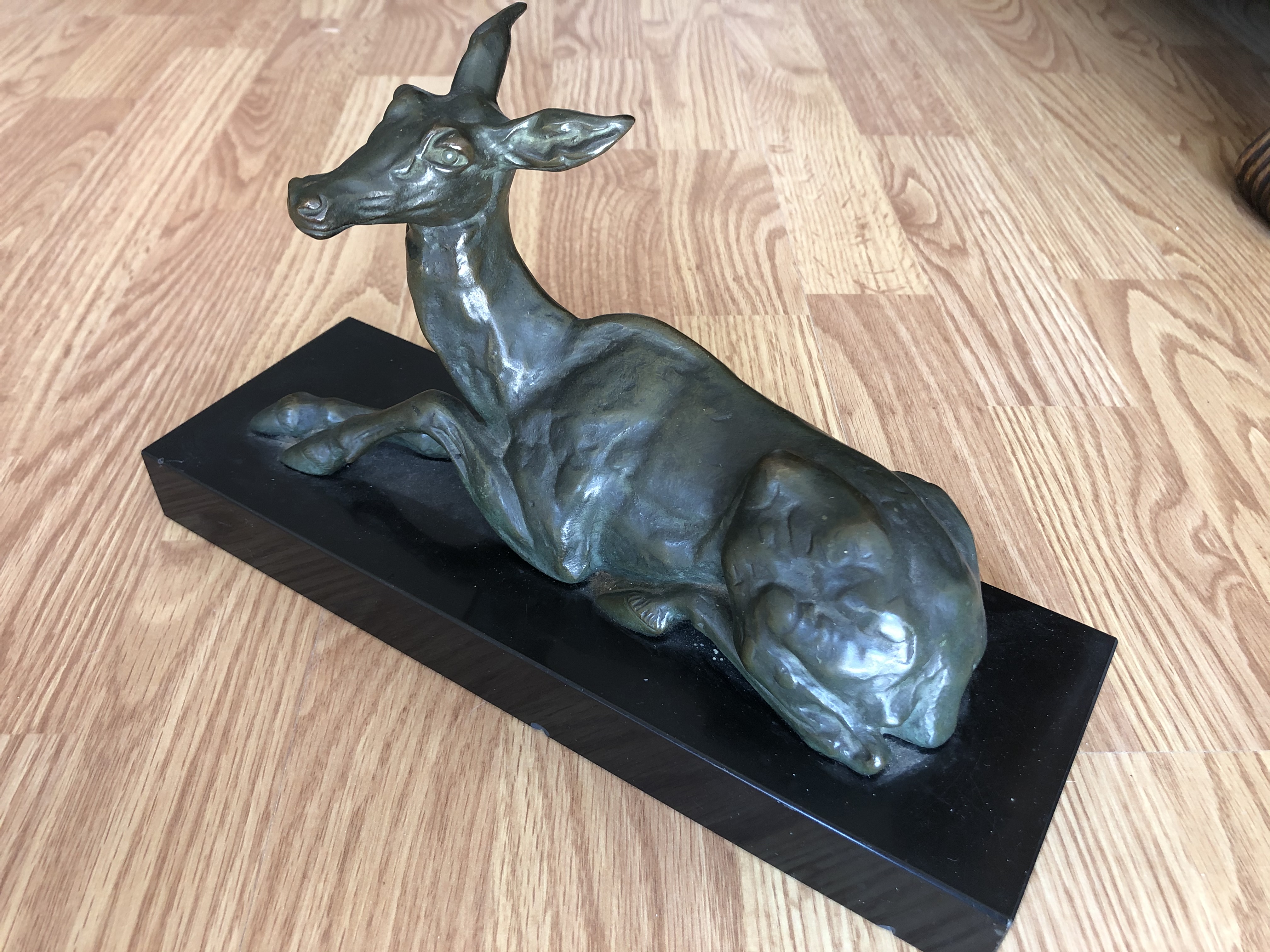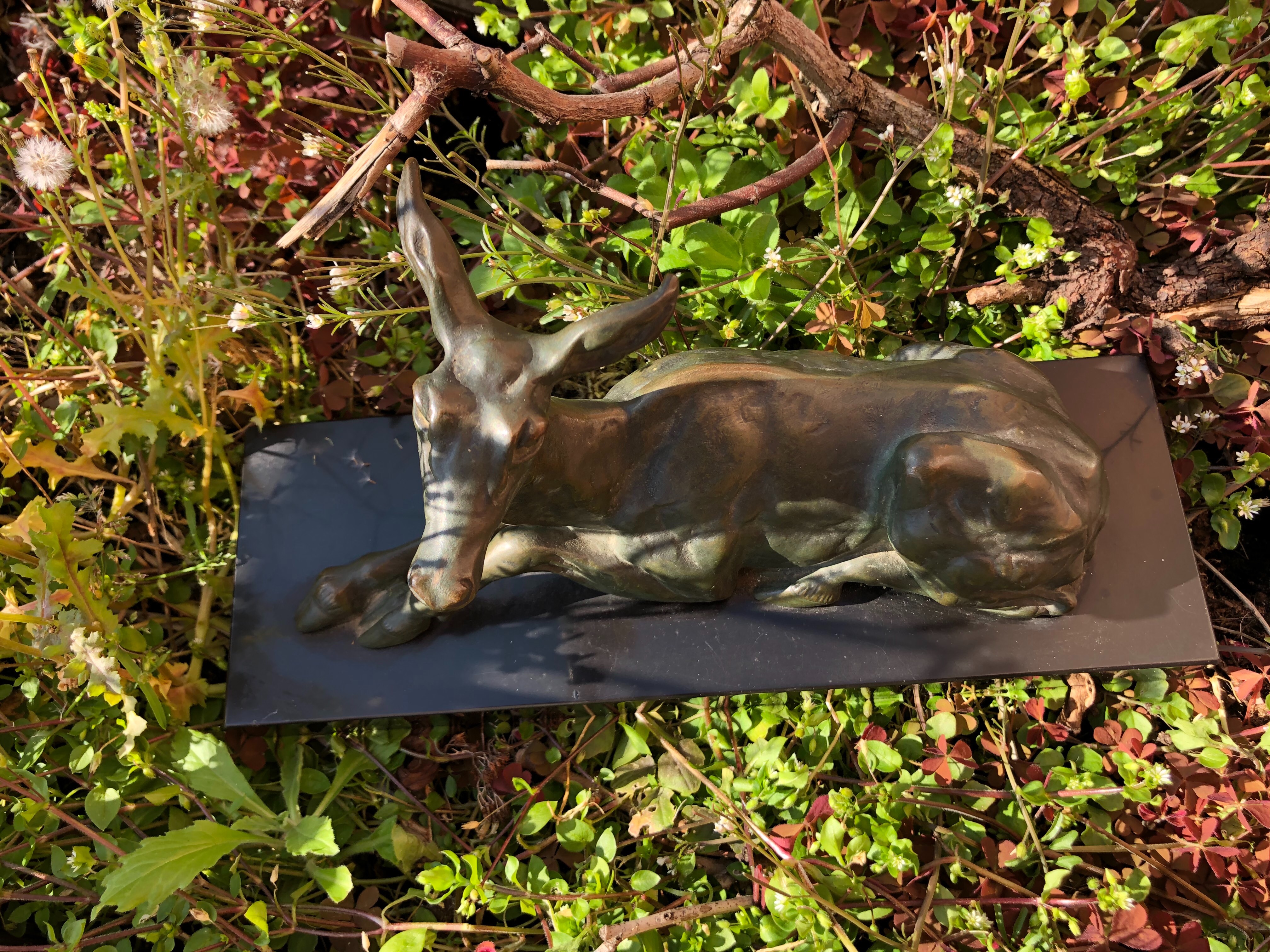 Charmante biche couchée en bronze patiné sur socle en marbre noir, signée HELBERT.